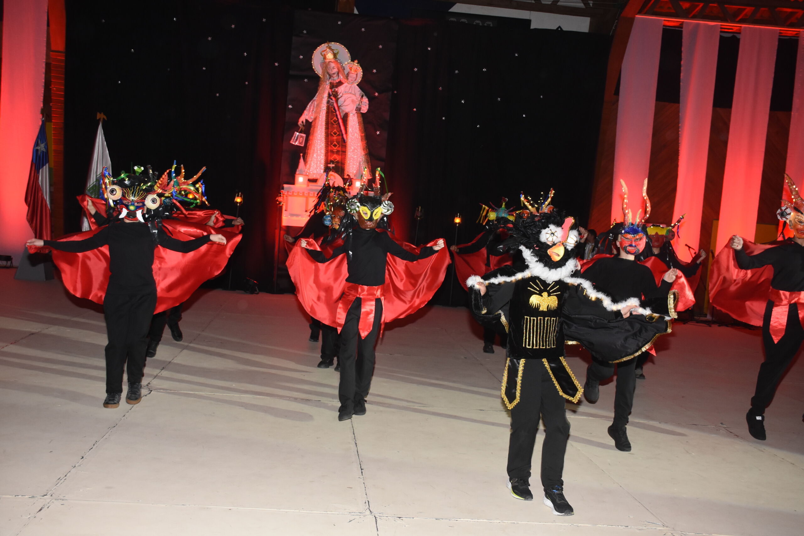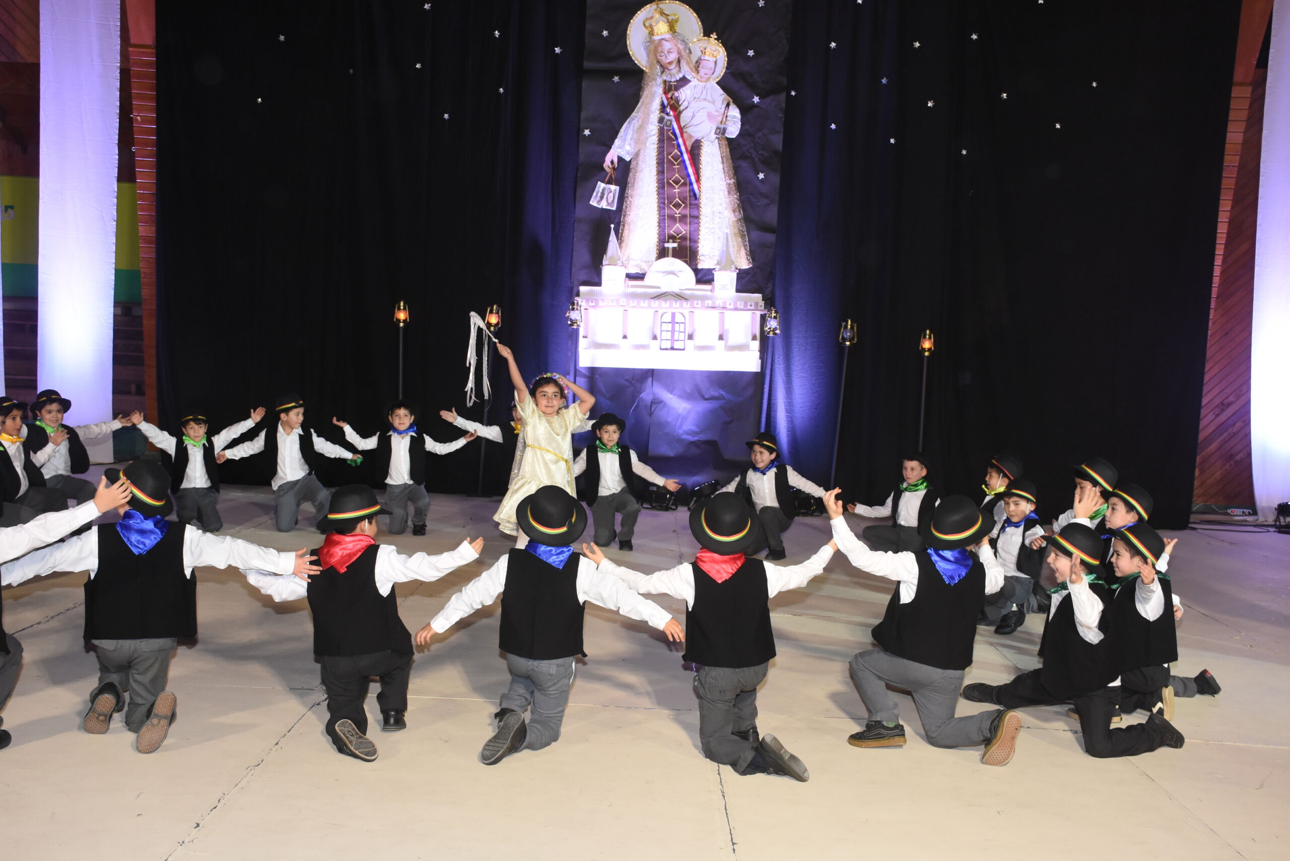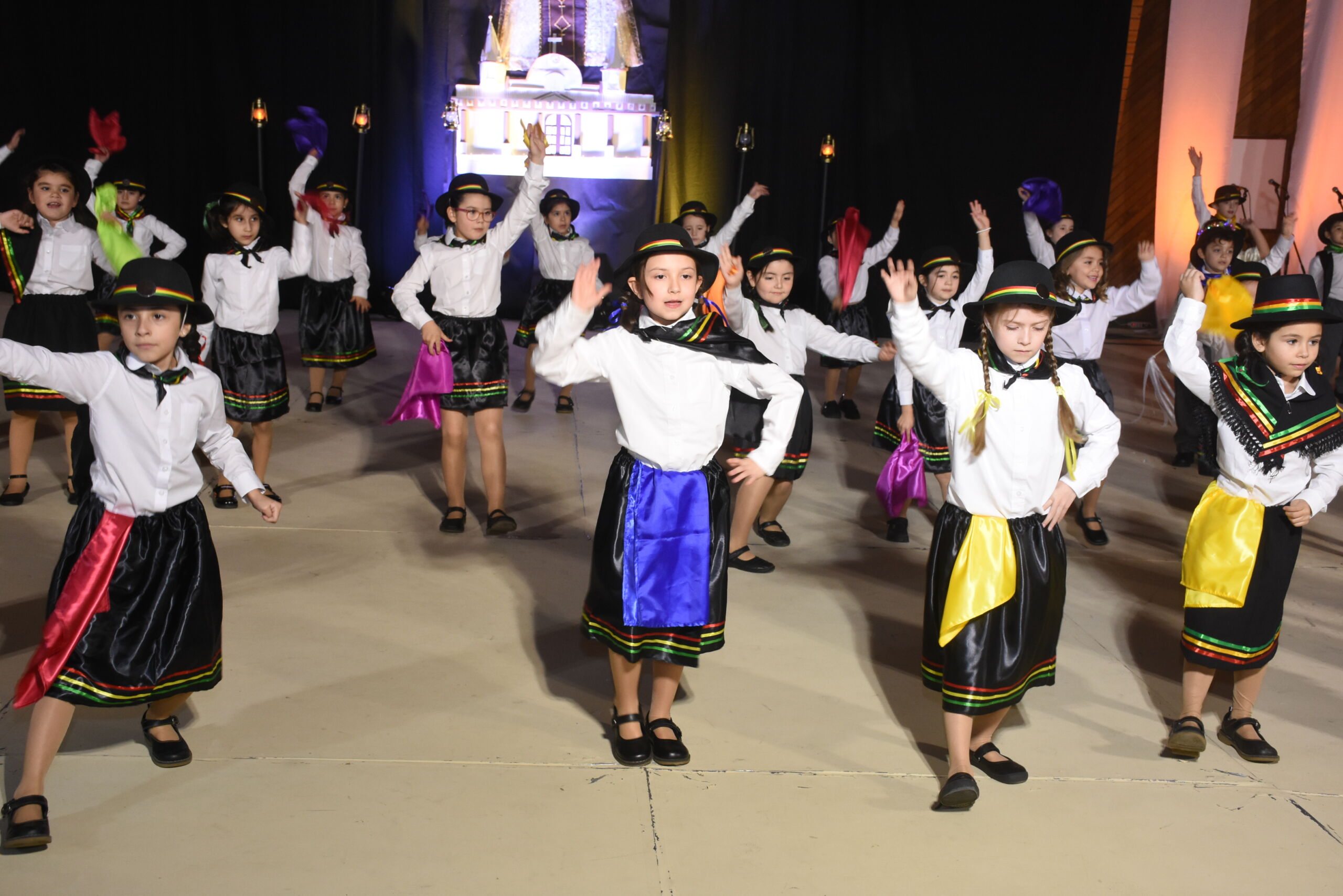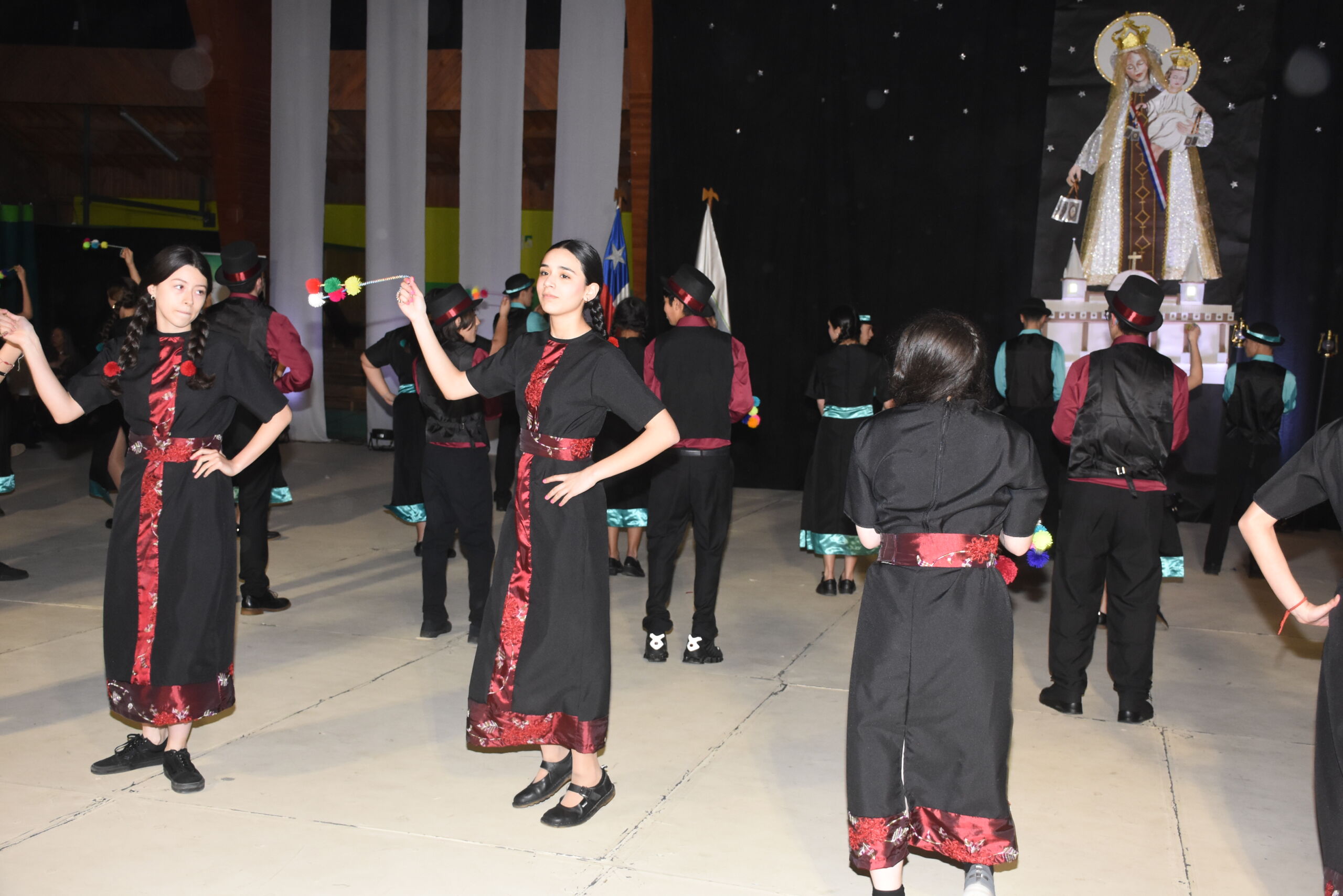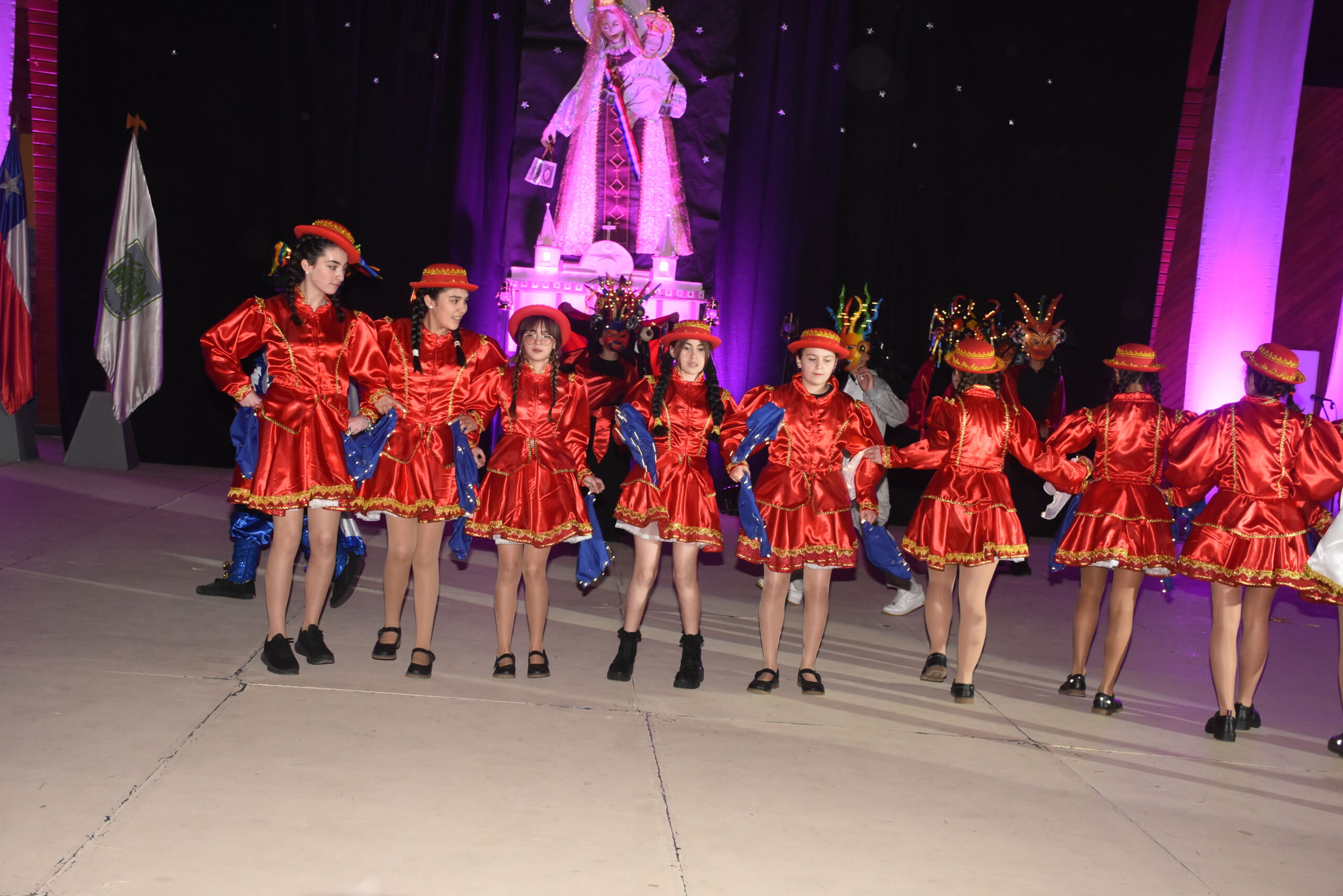 Desde 1° básico hasta IV° medio, nuestros alumnos junto a los profesores de Educación Física se unieron en un espectáculo inspirado en La Tirana y en los bailes nortinos, en homenaje a la Virgen del Carmen, patrona de Chile.